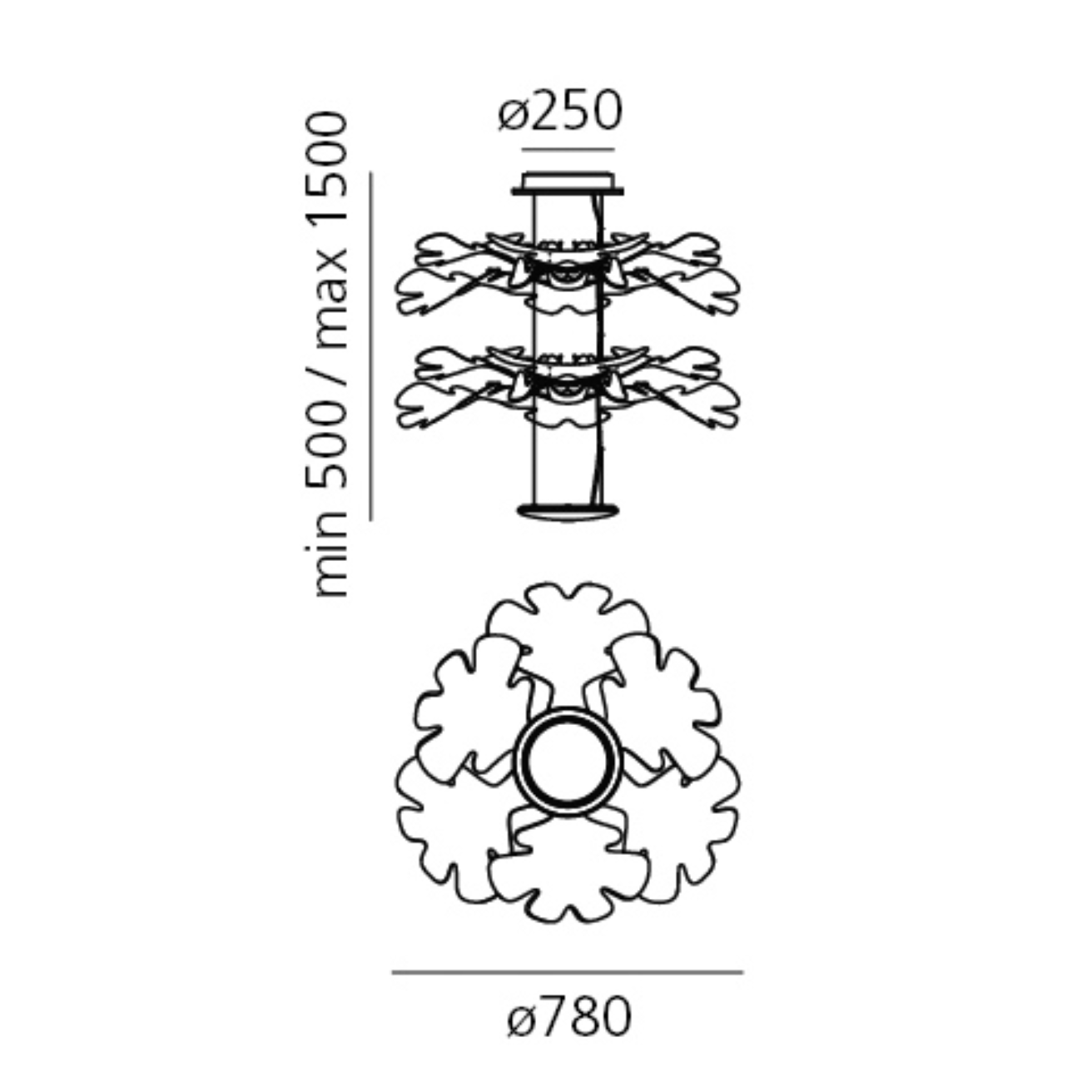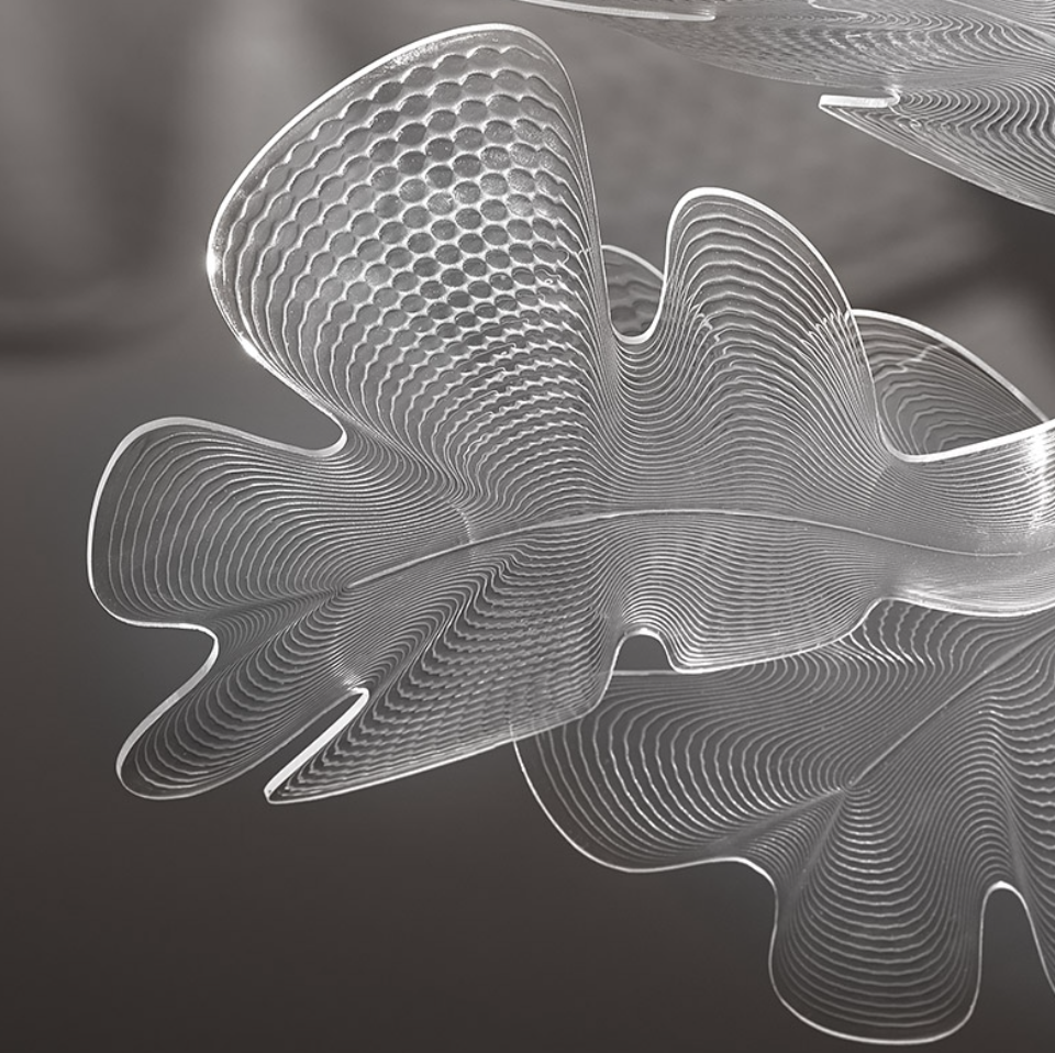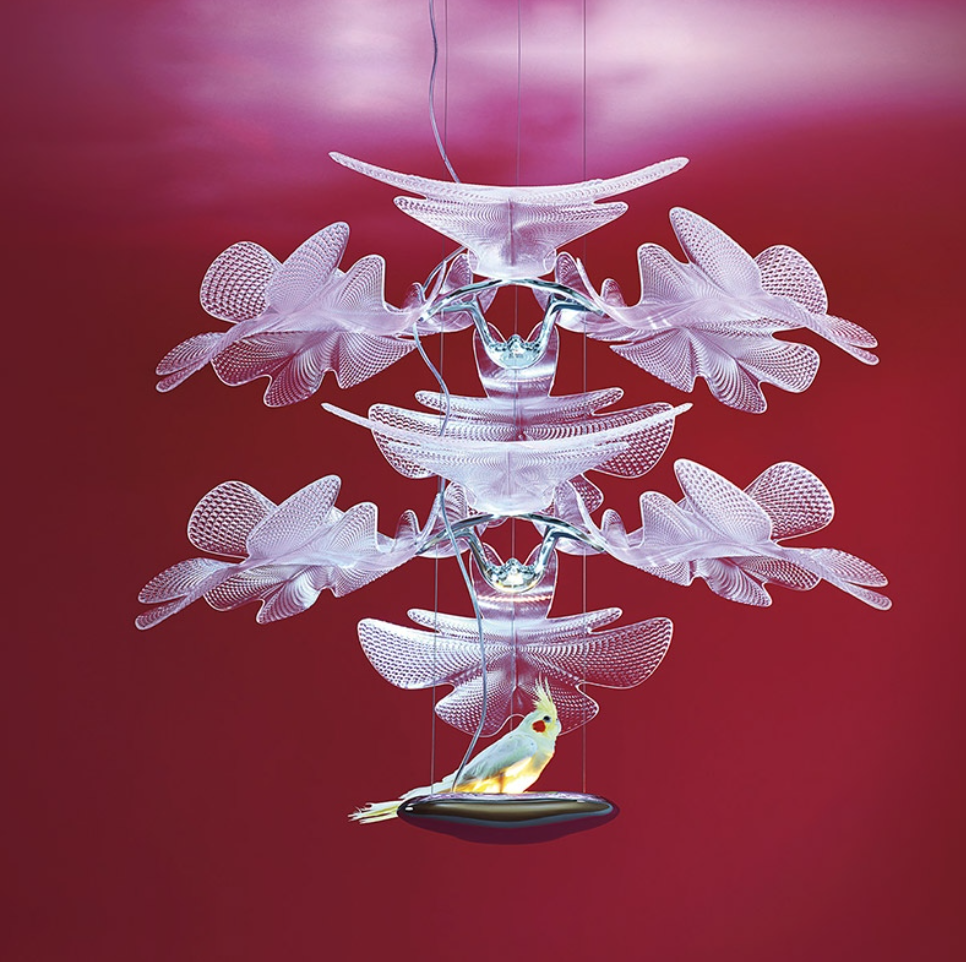 Chlorophilia, presented in 2015, define an optical and compositive principle which could be repeated multiplying the elements to create compositions, which develop in space on multiple levels or widen in lenght. Chlorophilia 2 doubles the transparent surface on two levels supporting even more the scenic presence of this suspension. Chlorophilia is a new project by Ross Lovegrove, who highlights once again the skill of Artemide in the light engine of the lighting body through his signature approach to organic and fluid forms. It is a highly scenic, yet light suspension appliance that, when switched on, unveils a contrast of delicate shades interacting with space and completing it. Its body contains a LED COB that works as a heatsink, as well as light phytomorphic elements made of moulded technopolymer, which combine the gently wavy texture with an uneven section that works as an optical lens. The suspended central body emits indirect light, which is filtered and refracted by three clear surfaces, whose natural shape recalls natural elements, leaves. These three elements are arranged in a sunburst display and partly overlapped to multiply the shadow contrast, thus generating a scenic effect on the ceiling, however combined with appropriate ambient lighting. Chlorophilia defines an optical and building principle, which can be reproduced by multiplying its elements to create compositions that develop on multiple levels in space or whose width is expanded. “An installation of optical leaves conceived as a fusion of natural and artificial geometries. The light becomes interactive through caustic projection onto the ceiling creating a delicate and feminine ethereal space expanding effect.” Ross Lovegrove